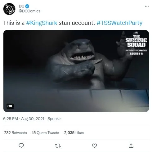 Scripted Twitter watch parties to promote The Suicide Squad, Wonder Woman 1984, and Peacemaker.