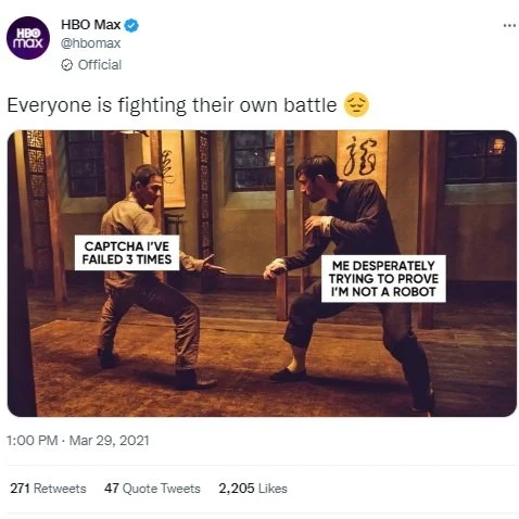 As a lead copywriter for HBO Max social accounts during its launch year, I helped define their social TOV while building brand credibility through IP/fandom knowledge and memes/comedic posts. This one was an early favorite.